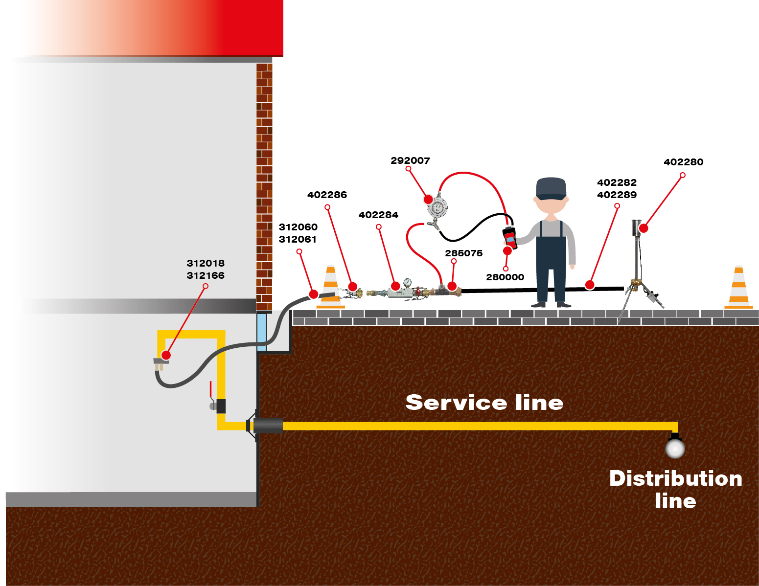 Existing mains connection that is in operation must first be degassed before starting maintenance work. To do this, the nearest valves in the distribution or supply pipeline to which the mains connection pipeline is connected should be closed. If necessary, a bypass pipeline must be laid beforehand so that other house connections are not unintentionally disconnected from the gas supply. Usually, a connection to the mains connection pipeline is made from the inside of the house concerned afterwards or beforehand. There are various options for this within the house installation.