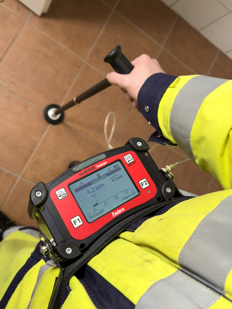 The actual leak detection was then carried out systematically using the bell probe. We deliberately avoided measuring directly on the tiles and instead focused on the joints, since gas diffuses much more quickly through joint compound than through fired tiles.