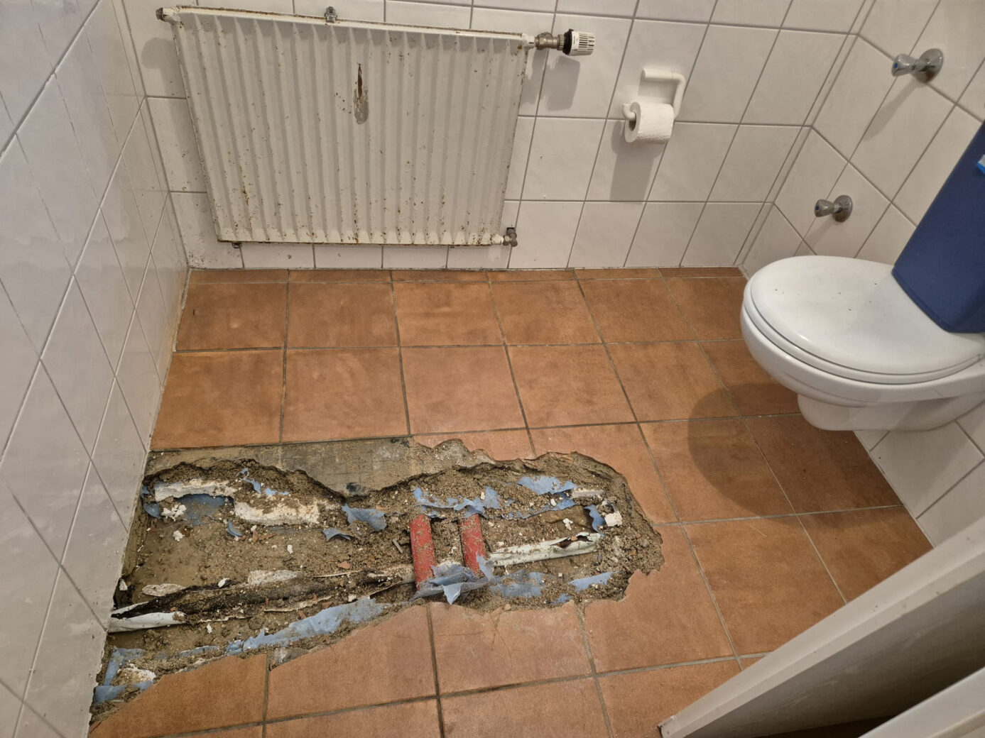The challenge: the exact route of the pipes in the old building is not clearly documented. The pipes in the shooting club run beneath the floor, under the screed and insulation. Only a small number of replacement tiles are available. Opening up a large section of the floor would therefore not only incur high costs but also damage the building structure.