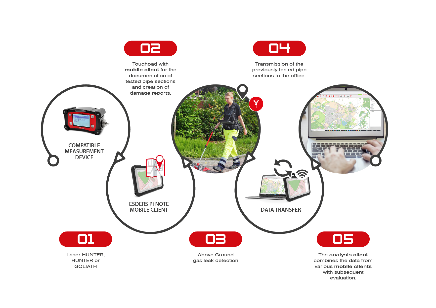 The mobile client is the application of Esders Pi NOTE that is installed on a toughpad or notebook of the person who conducts the pipeline inspection in the field. The measuring device is connected via wireless data transfer which enables a continuous record of gas concentrations.